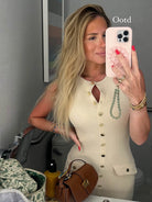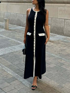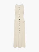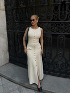 Effortlessly refined, the Aurelia Sleeveless Knit Maxi Dress blends classic design with modern versatility. Featuring a clean round neckline and a sleeveless cut, this dress offers a timeless silhouette that transitions seamlessly between casual and elevated styling. The centre-front button closure, finished with elegant gold-tone buttons, adds a polished focal point while enhancing the dress’s understated charm.