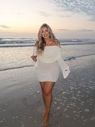 Effortlessly chic and contemporary, the Arden Strapless Bouclé Knit Mini Dress is designed to make a refined statement. Featuring a sleek strapless neckline, this dress beautifully highlights the shoulders while maintaining a clean, modern silhouette. The addition of long sleeves with an elegant overlay brings a sophisticated contrast, elevating the overall look with subtle drama.