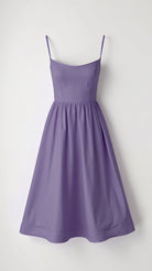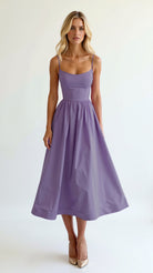 A timeless midi dress with delicate shoulder straps and a beautifully structured bodice that seamlessly flows into a full, gathered skirt. This versatile piece balances elegance and simplicity, perfect for both casual daytime looks and refined evening events.