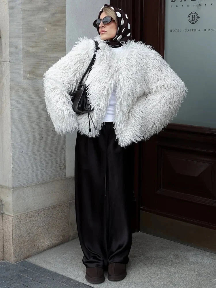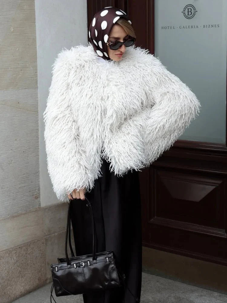 Elevate your winter wardrobe with the Elsie Fluffy Faux Fur Coat. This luxurious overcoat combines style and comfort, making it perfect for any occasion. With its loose fit and high waist design, this jacket not only keeps you warm but also enhances your silhouette.