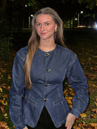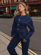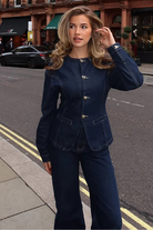 The tailored jacket enhances the waist and creates a clean, feminine shape, while the wide-leg jeans add balance and a contemporary edge. Designed to transition seamlessly from day to evening, this denim suit is perfect for city wear, smart-casual occasions, brunch dates, or elevated everyday styling.