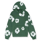The hoodie offers a relaxed fit with a classic hooded neckline, while the joggers provide comfort with a casual silhouette suited for lounging, travel, or off-duty days. The dark green base color combined with the bold white floral print creates a striking yet wearable look that stands out without compromising versatility.