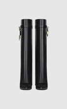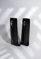 Make a bold fashion statement with these sculptural black knee-high boots featuring a dramatic wedge heel and minimalist silhouette. These avant-garde boots blend high fashion with functionality, offering a sleek, glossy exterior that demands attention.