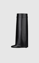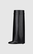 Sculptural Black Wedge Knee-High Boots in Glossy Finish