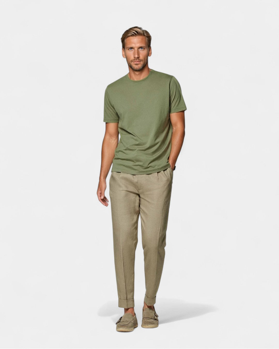 Whether worn under a jacket or on its own, this olive green Supima T-shirt is your go-to for premium comfort and everyday sophistication.