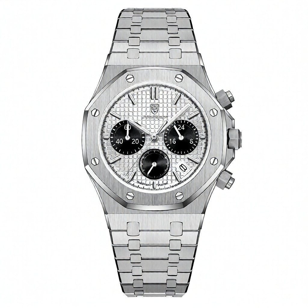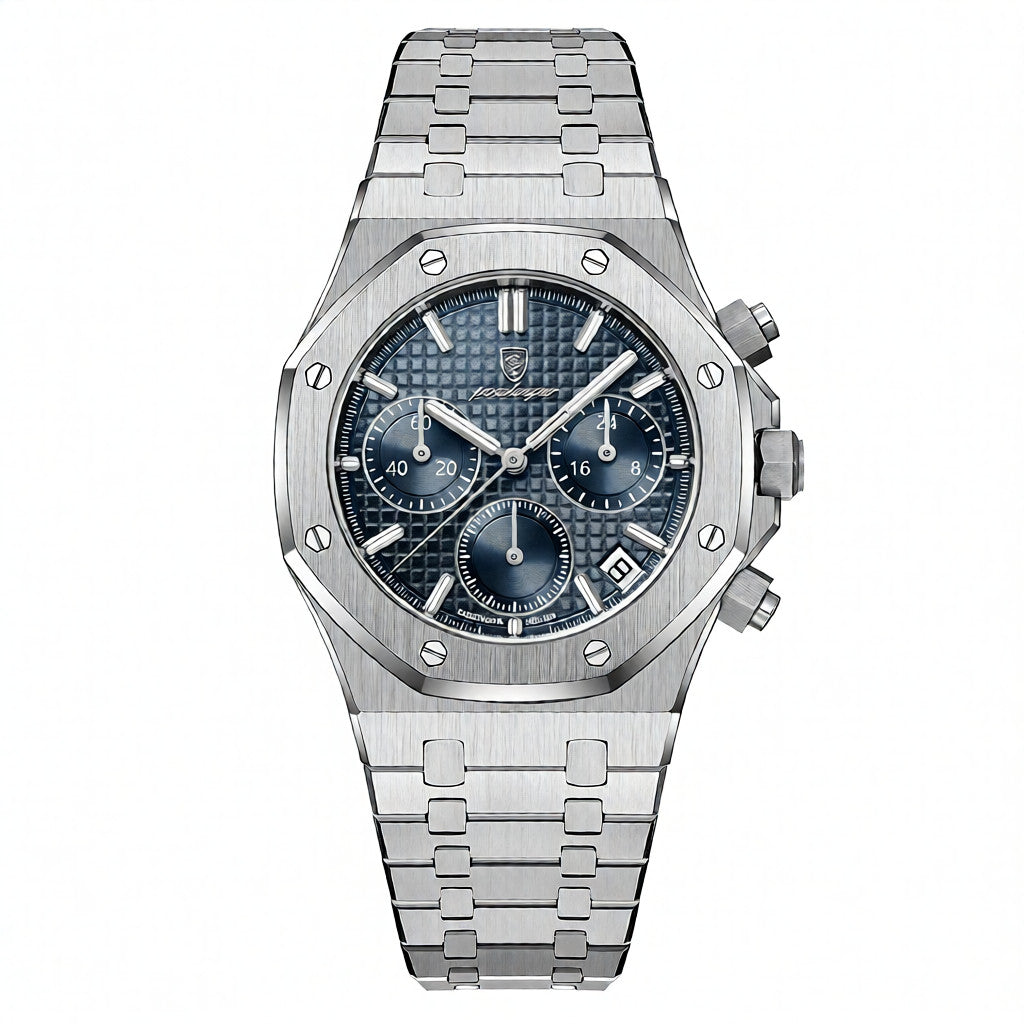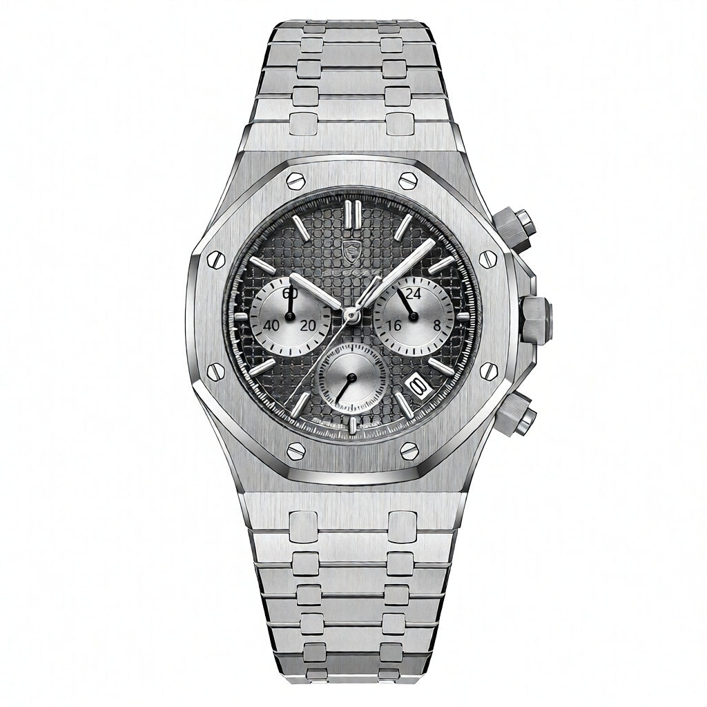 Designed for men who appreciate sharp detail and confident styling, this stainless steel chronograph watch delivers a refined balance of structure and modern appeal. The textured dial adds depth and character, while the multi-function chronograph layout brings a technical edge without compromising elegance. Crafted with a solid stainless steel case and integrated metal bracelet, it offers a comfortable, secure feel on the wrist throughout the day. The quartz movement ensures dependable timekeeping, complemented by luminous markers for clear visibility in varied lighting. Suitable for both professional settings and everyday wear in the United Kingdom, this watch makes a composed statement with effortless versatility.